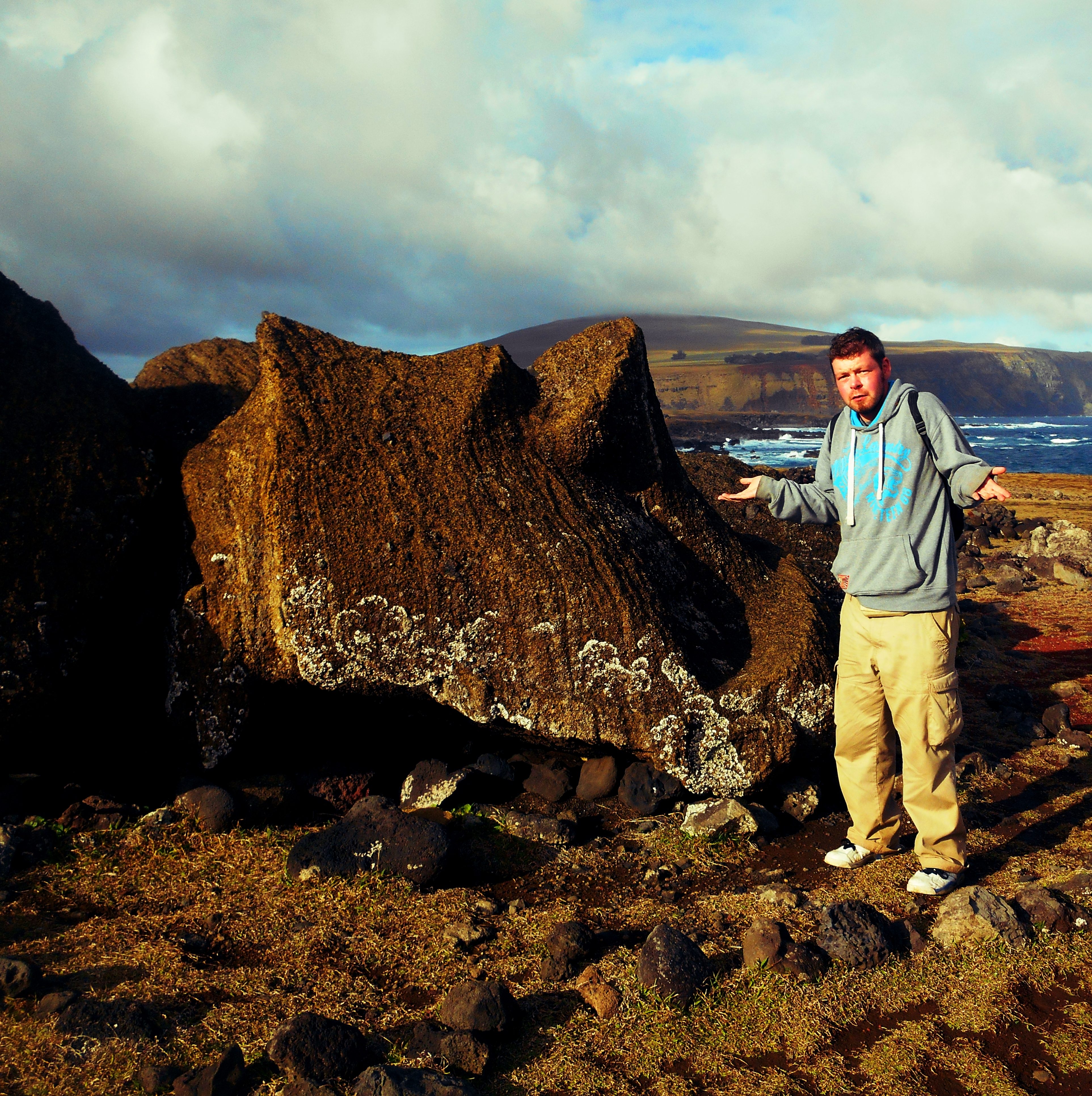 That second evening was very pleasant. We finally had good weather and we had rented a scooter. After getting away with murder in South East Asia (disclaimer: not literally….) I was surprised how strict they were here about renting stuff without a driving license. I’d left mine at home so Andrea used his, along with his natural Italian scootering skills, to drive us around. On the way back from Tongariki to Hanga Roa we passed by some of the fallen maoi, including the largest statue ever carved. It just lay there face down in a field surrounded by a bunch of horses throwing it disapproving “go home you’re drunk” glances.